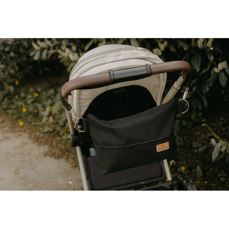 Organizér na kočík T-TOMI je ideálnym moderným doplnkom pre každý kočík, ktorý spĺňa potreby a požiadavky každej modernej mamičky. Praktický doplnok pri cestovaní s dieťaťom nielen po meste s kočíkom, ale aj ako každodenný doplnok cez rameno na plienky, prebaľovaciu podložku, cumlík, obrúsky, telefón, slúchadlá, doklady alebo peňaženku. V hornej časti sú kovové polokrúžky, pomocou ktorých môžete organizér pripnúť na klipy. Na prednej strane sa nachádza vrecko na mobilný telefón a vrecko na drobnosti. Vo vnútri organizéra sa nachádzajú dalšie dve praktické vrecká. Pripevnenie ku kočíku je veľmi jednoduché a rýchle pomocou kovových karabín. Ramenný popruh je možné meniť podľa nálady a potrieb.