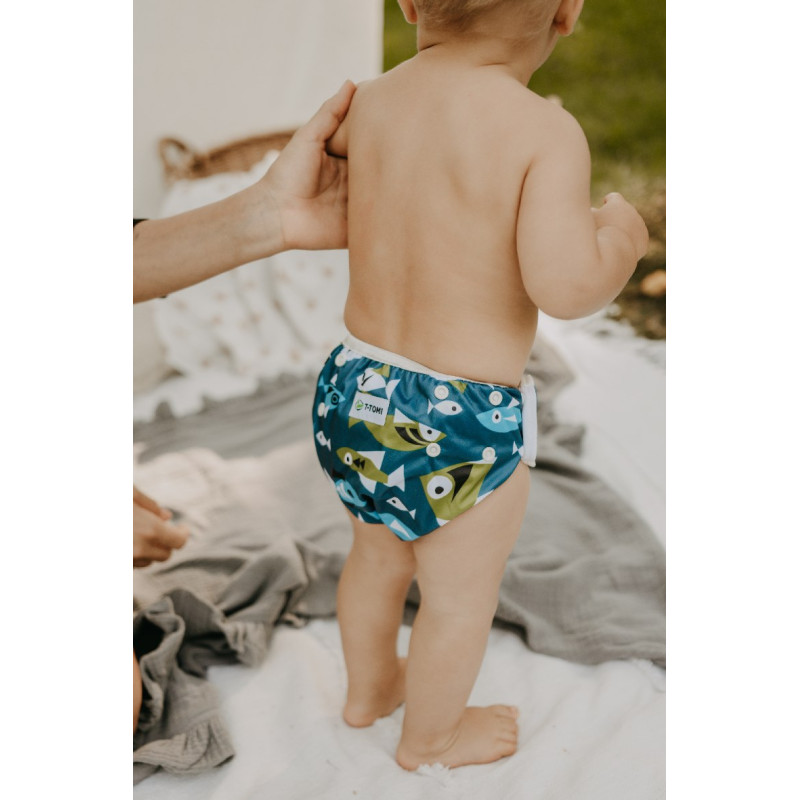 Plienkové plavky T-TOMI v modernom nadčasovom dizajne sú určené pre plávanie bábätiek cca od 5 do 15 kg. Tieto plavky sú vhodné ako pre novorodencov tak aj pre batoľatá a to vďaka jednoduchému systému patentiek, pomocou ktorých sa požadovaná veľkosť ľahko nastavuje. Vnútorná strana plienkových plaviek je vybavená praktickou sieťkou, ktorá zachytí prípadné "nehody" bábätka vo vode. Veľkou výhodou týchto plienkových plaviek T-TOMI je ich ekonomická stránka oproti jednorazovým plienkovým plavkám.